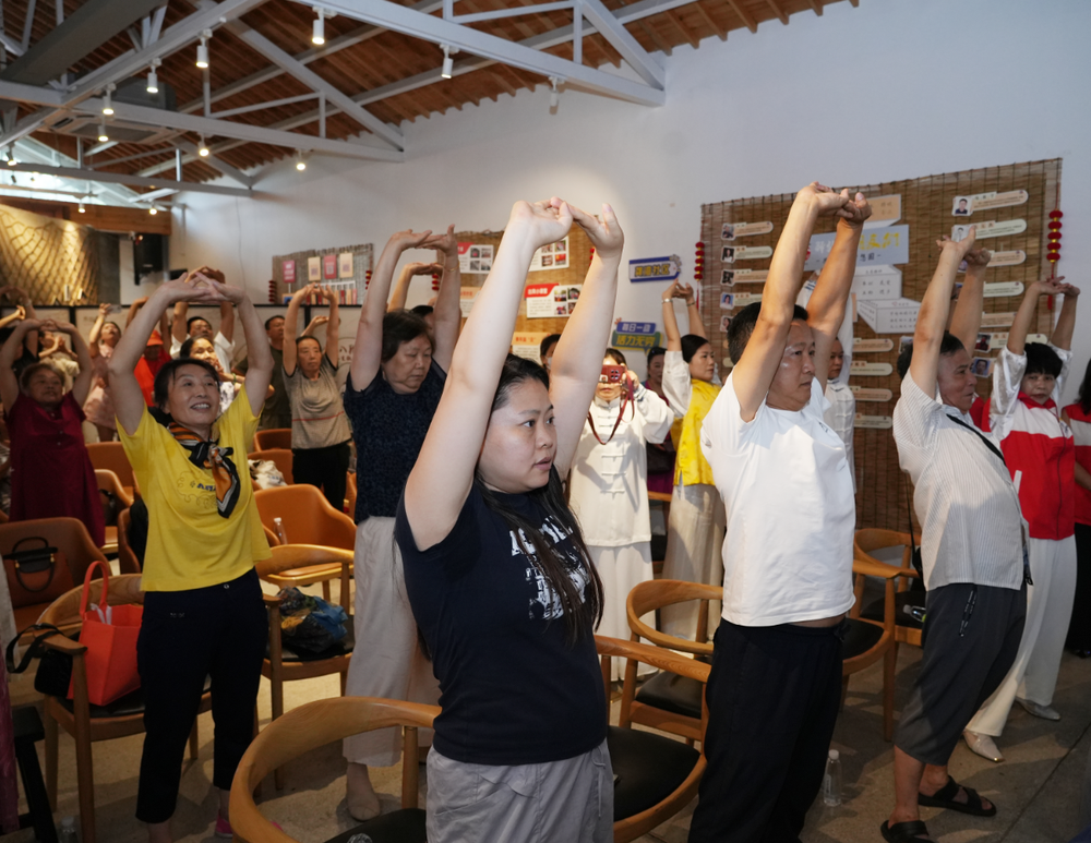 “吸气、吐气,身体慢慢下沉……”在八段锦教学环节,无限极安徽分公司八段锦健身操教练储维平、王风、谢其云带着众多居民,伴着舒缓音乐缓缓起势:两脚开步站立,沉肩坠肘,松腕舒指。领练者气沉丹田,在呼吸吐纳间指导大家完成“左右开弓似射雕”等动作。