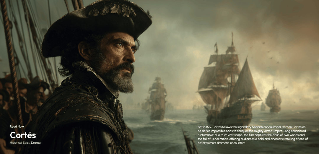 一张是被好莱坞称为“史上最难拍史诗巨作”、素来是好莱坞呼声最高、但一直排名未拍摄电影前10的《科尔特斯》(Cortés)。这部电影之所以难拍,是因为它用传统电影制作的方式成本太高太高,但手握技术并不惧怕的Utopai为其邀请来了奥斯卡提名编剧Nicholas Kazan执笔,并邀请了好莱坞名列49的概念设计师Kirk Petruccelli来执导。